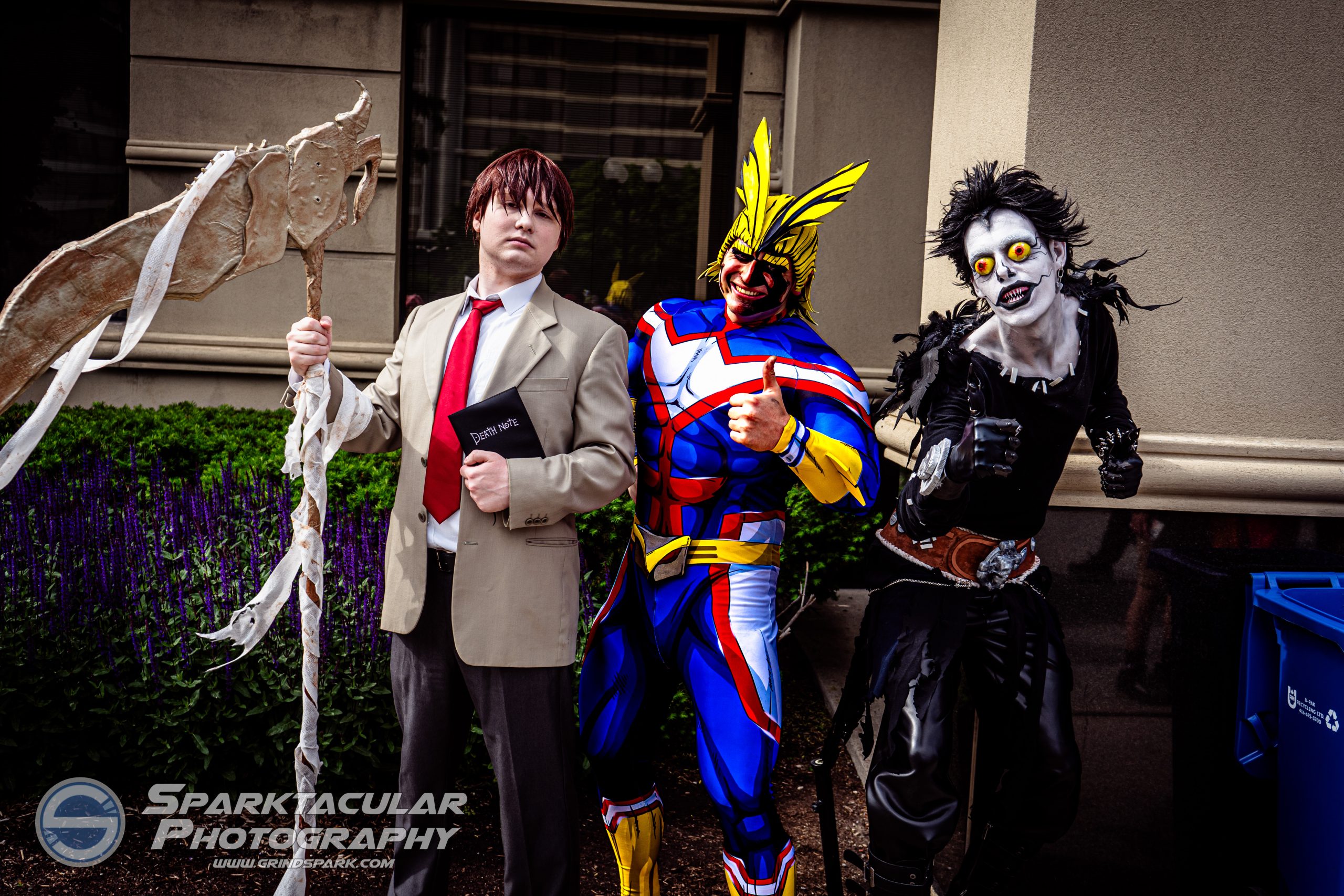 This creatively stylized photo contrasts the dark and gritty cosplays from Death Note with the bright and heroic intrusion of the #1 Hero All Might.